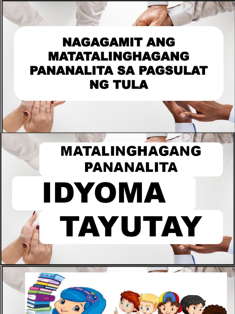 Nabibigyan ng kahulugan ang mga Idyomatikong Pagpapahayag at nakikilala ang mga Uri ng Tayutay. TAYUTAY Sa paksang ito tutuklasin natin ngayon ang mga iba ibang uri ng mga tayutay at mga halimbawa ng mga uri nito. Idyoma isang pagpapahayag na ang kahulugan ay hindi komposisyunal.