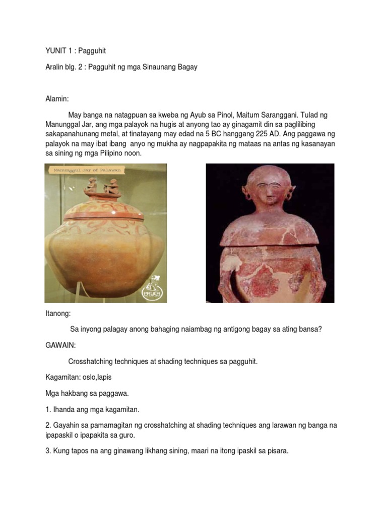 16 20 sining iguhit ang kung ang lawaran ay sinaunang. Ang isa pang paraan ng shading ay ang contour shading na nagagawa sa pamamagitan ng patagilid na pagkiskis ng lapis o iba pang gamit pangguhit sa papel. Pagguhit ng mga Arkeolohikal na Artifact Aralin 4.