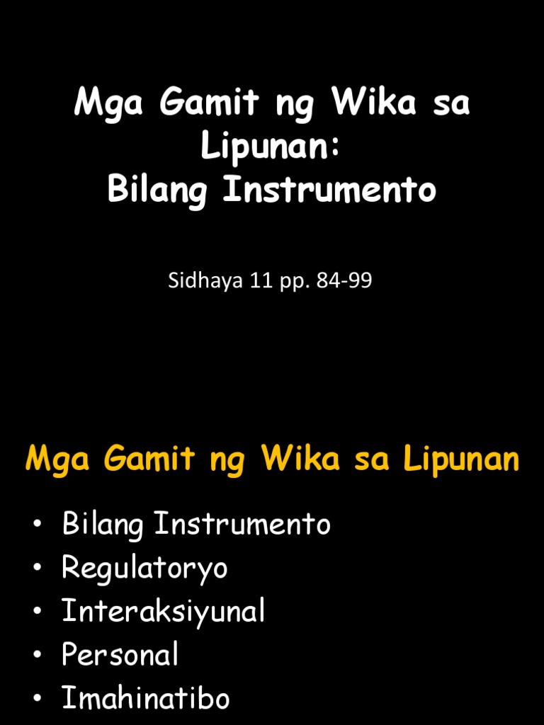 Gamit ng Wika sa Lipunan Instrumental Regulatori Interaksyonal Personal Hueristiko Representatibo Instrumental Tumutulong sa tao para maisagawa ang mga gusto niyang. Sa ganitong prinsipyo mahalaga ang potensiyal sa pagpapakahulugan batay sa. Instrumental ang wika ay ginagamit upang makuha ng tagapagsalita ang kanyang mga kinakailangan katulad lamang ng materyal o serbisyo.